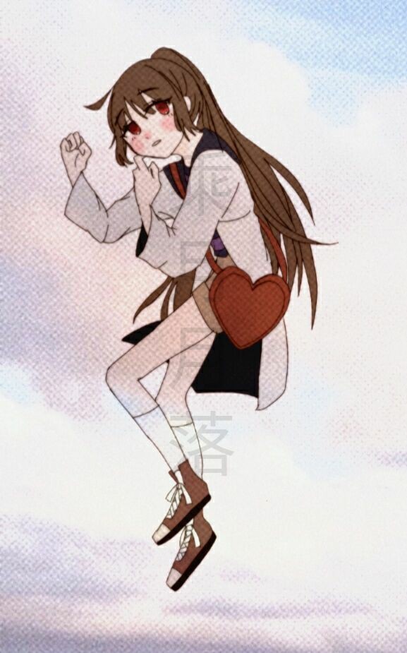 红色眼睛,棕色长发扎成马尾辫,里面穿着条纹衬衫,棕色短裤,外面是白色外套。身上背着一个红色的心形挎包。