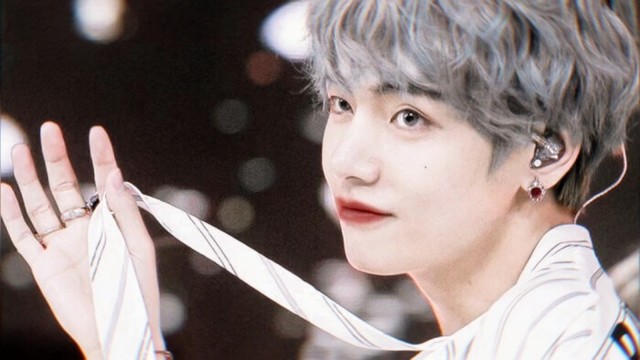 金泰亨一副花花公子的样子挽上金硕珍的肩膀.与众人严肃的着装不同.他身着花色的西装还带着镶着红宝石的耳坠显得十分风流.