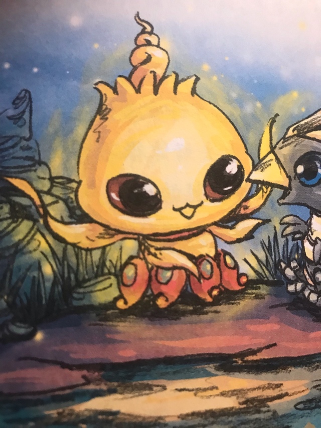 本体形态:花苞似的脑袋,肉肉的,倒m的嘴巴,头顶有两根触须似开花一样从中伸出并缠绕在一起。身体微胖,背部有六根须翅,无四肢,身体底部的一圈长着似铃兰花的盘轮。眼睛为椭圆形,有点倾斜。身体左半部分是金色的,盘轮为红绿相间,右半部分是淡紫色的,盘轮为黑红相间。