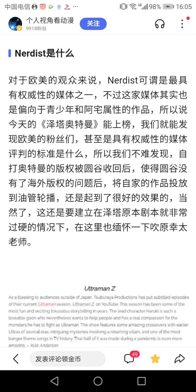 作者大大泽塔这部由吹原幸太老师做的剧本,加上做泽塔奥特曼的所有制作参与人的结果,泽塔无论是剧情,特摄拍摄手法,人物刻画,特效都是上等水准,圆谷这么一搞,直接让人觉得公司倒退20年,泽塔真就旧平成水准(仅仅水准,旧平成和昭和的深刻故事,泽塔的剧情是不能比的,现在圆谷拍奥是为了宣传,商业化的满足条件下拍摄的,圆谷就算想变成以前的讲故事剧情,也因为必须保证商业化跟得上的条件下拍摄,所以现在的奥是不能和以前的相提并论的,但泽塔的优秀还是能判定的)
