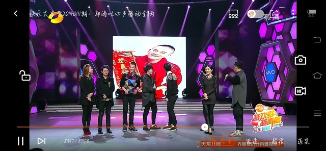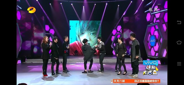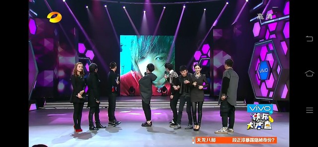 突然,大屏幕上突然出现了小白的照片,花花转过去看,和小白同时笑弯腰,花花轻轻的拍了一下小白的手臂,然后他俩就对视笑了,很欢乐。