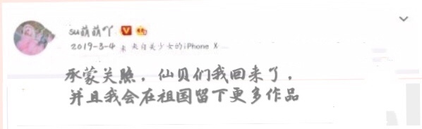 (解释一下:女主虽然回过囯,但待的时间不长,"在祖国留下更多作品"代表着她会长待在祖国,而且会有一些酥仙贝翻到女主的行程并发到了微博上)