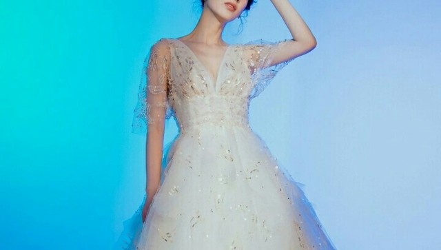 青云白的礼服裙显得小人儿格外娇小玲珑,V领的裁剪露出了精致的锁骨,修身的收腰使的原本就纤细的腰变得更加盈盈一握……裙纱上的水晶在清晨曦光中折射出完美的光弧,小人儿整个身子仿佛沐浴在圣光中……