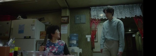 正在做饭的两个人转过头,表情有些惊诧,随后其中一个立即由惊变喜。