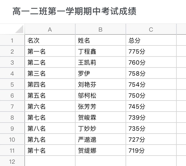 高一二班第一学期期中考试成绩
