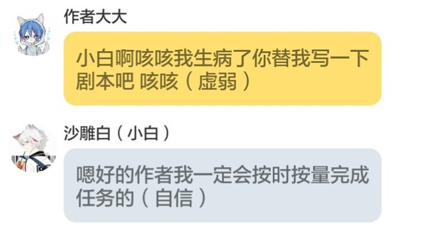 沙雕白(小白)哈喽大家好今今天因为作者生病了所以说换我来给你们写剧本啊啊作者以前你虐我现在你信不信我把你的剧写的超级烂哈哈哈哈哈
