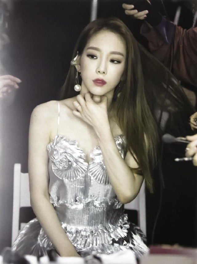 金泰妍穿着银色礼服在休息室补着妆。