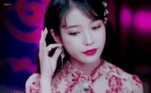 我穿着复古的粉色碎花长裙,手里拿着宝石样式的长款耳环,放到耳边。