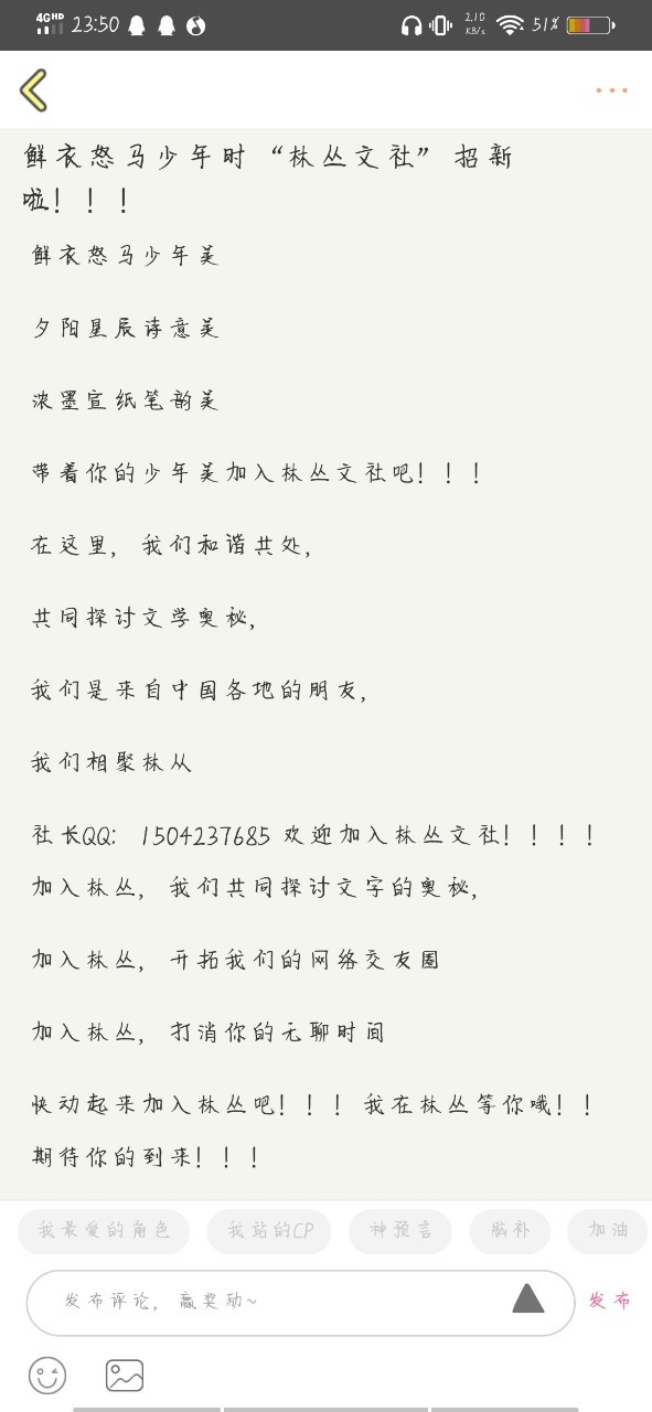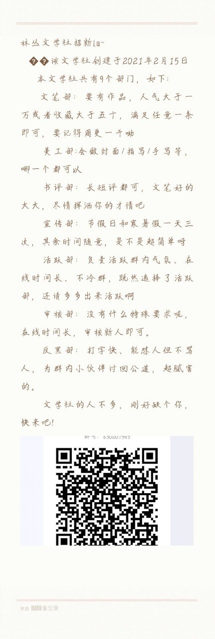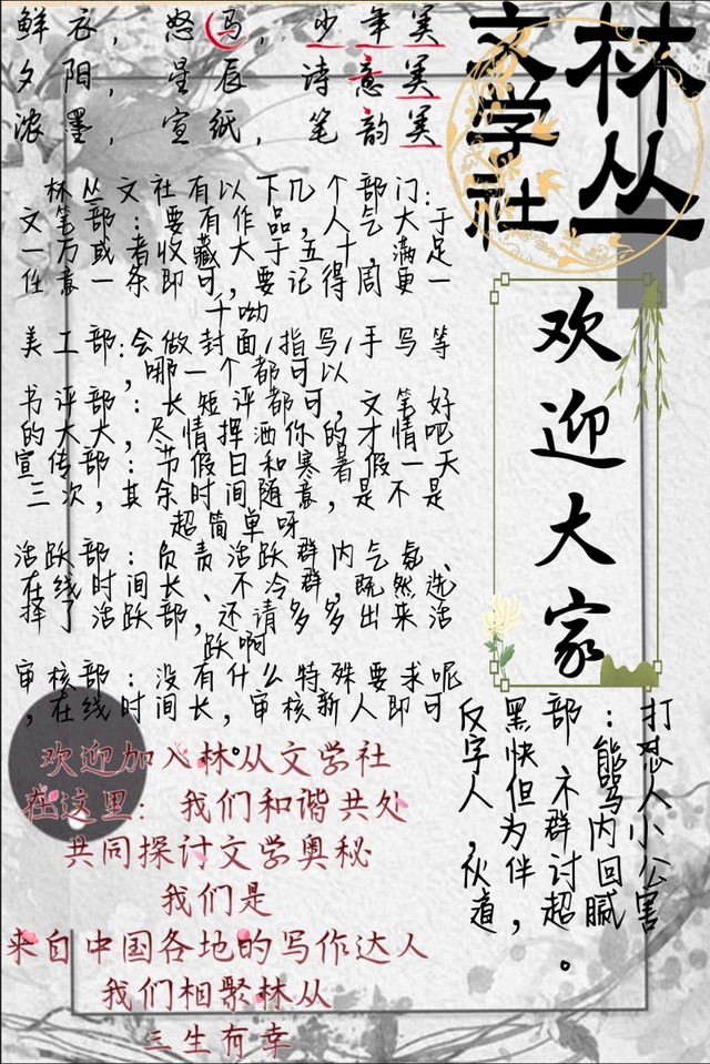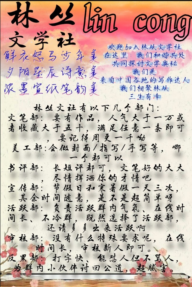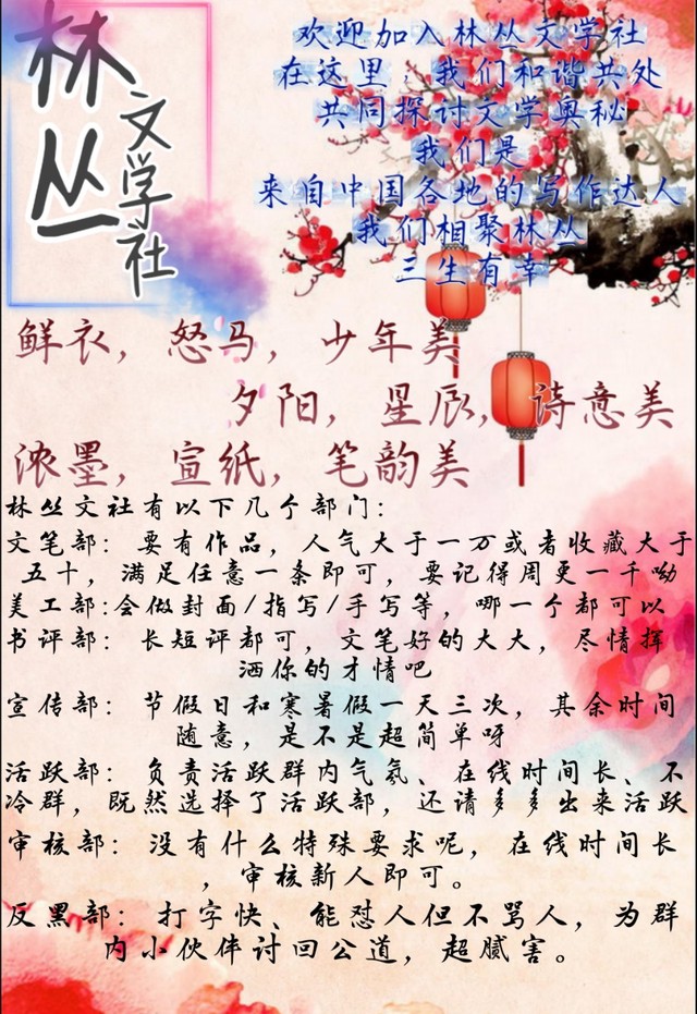 最后有写文的小伙伴,还没有加入文社的小可爱,或者是可以双社和多社的,可以考虑一下加入林丛文社。