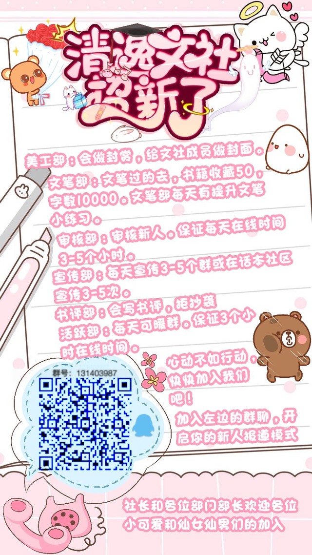 墨白七清流不卖无死人, 逸勉诸君共提升。 文笔尚可推荐看, 社团招新只等君。 清逸文社收人啦! ✨✨✨✨✨ 清逸文社。破壳于2.16🎉 目前人员较少,来了极有可能成为元老, 目前缺几个部长,有能力者都有几率成为部长哦~ 美工部部长:缺 宣传部部长:缺 ——进社须审核,作品挂标签就可 —有无作品都可✓主页挂标签都行。 来了我们宠你! 美工部:会做封赏,给文社成员做封面。可要求一定费用。 文笔部:文笔过的去,书籍收藏100+,人气五万,文笔部每天有提升文笔小练习。上学期间改为月练。 审核部:审核新人。保证每天在线时间3-5个小时。 宣传部:每天宣传3-5个群或在话本社区宣传3-5次。 书评部:会写书评,拒抄袭 活跃部:每天可暖群。保证3个小时在线时间。