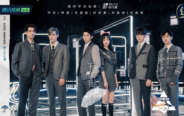 到了最后一组的表演《下雨了是我在想你》,也是今晚唯一一组传统抒情风格的歌曲。这组的学员:林墨,利路修,甘望星,何屹繁,任胤蓬。