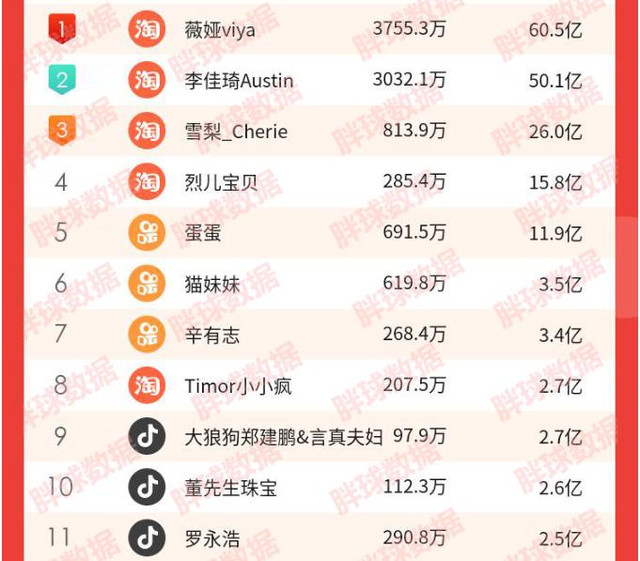 在今年的618直播带货排行榜中:薇娅60亿、李佳琦50亿、雪梨26亿排前三。