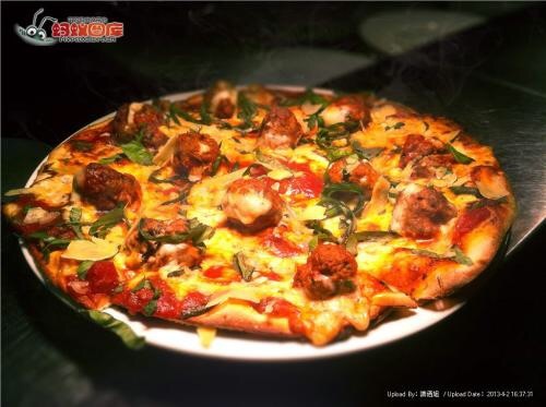 在看披萨,它是一种由特殊的饼底、乳酪、酱汁和馅料制成的,具有意大利风味的食品。新端上来的披萨散发着诱人的香气,金黄色的披萨上均匀的撒上了青红辣椒,中间还有被切得厚薄刚好的牛肉,牛肉上的黑椒粉末混合着披萨里面的洋葱散发着牛肉特有的肉香味。