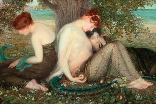 岛中心,有棵金苹果大树,果多而熟透了。有三个漂亮性感的女子在树下酣睡,她们旁边缠着巨龙……
