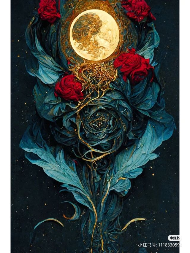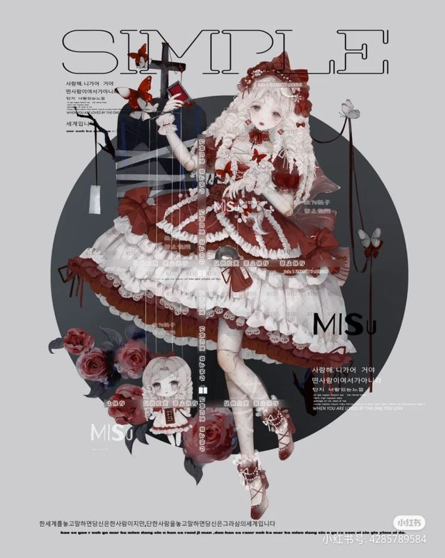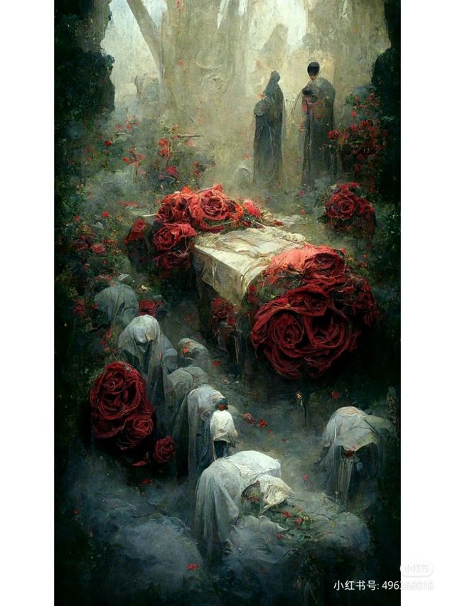 少女的穿着复杂,露出的腿细腻白嫩,餐桌的上面的吊灯还残余着一只断掉的手臂,周围很简单,只是有着玫瑰花的画