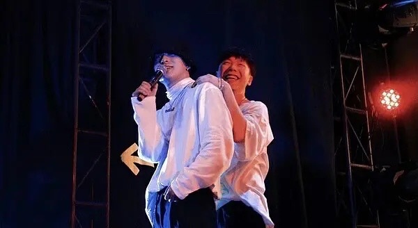 高天佐指了指另一边玩得正嗨的三个人,他们不组个劲舞团真的可惜。里面最出挑的人是Kc,“最会扭的rapper”这个名头可不是空穴来潮的。喝点小酒,眯着小眼睛,小腰一扭,小胳膊一甩,小腿一踢,整个人就是享受状态。他还有俩伴舞,张思源和侃迪,侃迪可能是喝得太多,已经完全放飞自我了,现在正抱着立着的麦架舞动起来了。相比起来飞奥小公主比较收敛。