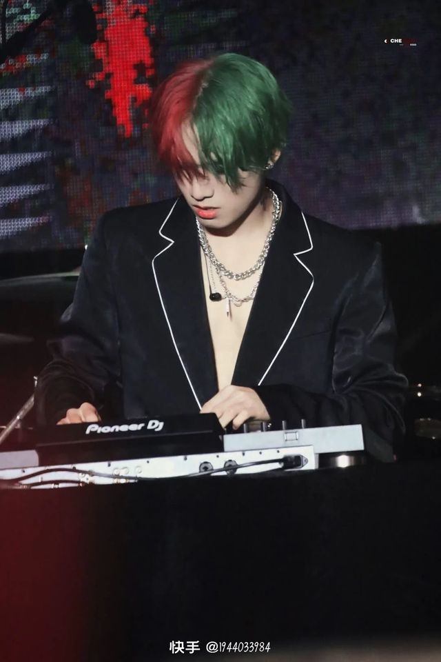 他穿着一身黑色西装领口大开