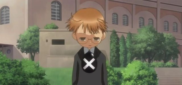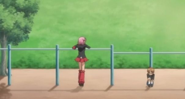 远处的楼顶,二阶堂双手插着裤袋,低头看着操场上的日奈森亚梦和铃木