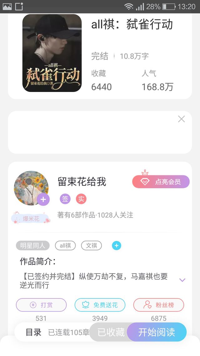 作者“第二个要推的是《all祺:弑雀行动》作者是,留束花给我,文笔也很好,就是前期有点虐小马哥,最后有番外,还很甜,这部小说的作者很宠粉,小说己经出第二部了”
