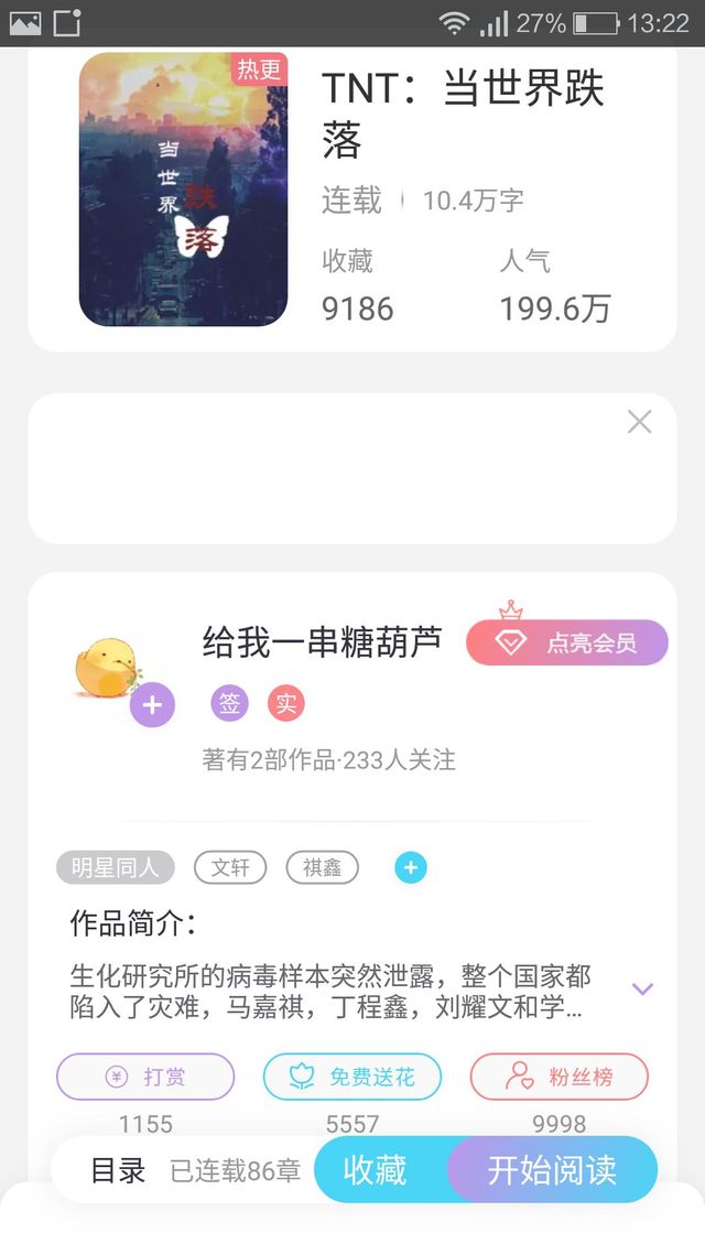 作者“最后要推荐的是《TNT:当世界跌落》书很好看,文笔好,情节大概是丧尸病毒爆发,他们在寻找抗体,抗体隐瞒了自己的身份,最后抗体被找到了,最后我不知道了,因为书还没更完,更新大约80多章了,反正书很好看。”