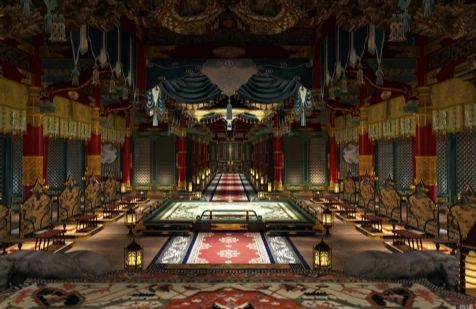 上好的白玉砖上铺着黄花点缀的深红色金丝织锦毯,天花板垂下一盏冰纹琉璃灯,每个黑漆云母石宴桌旁摆着一盏珐琅彩搭配黄铜烛灯,气度磅礴,金碧辉煌。