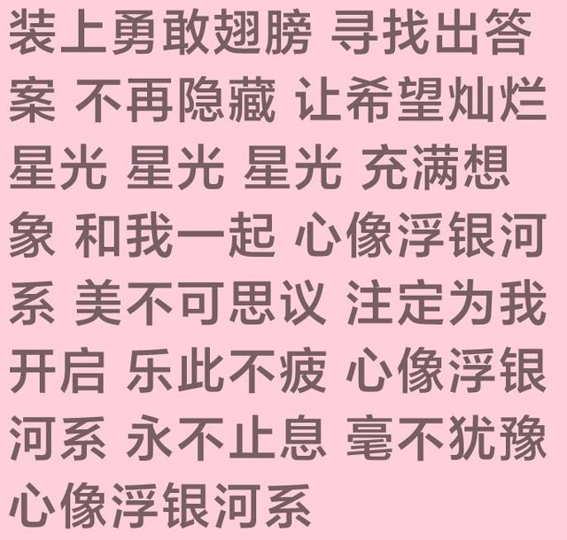 幻蓝星尘眼在发亮 正闪耀多少向往 向星芒 传达满满的渴望 就出发 要前进心之所想 加能量 加能量 全力起航 梦一样 编织着甜蜜磁场 快跟上 往宇宙深处飞翔 我仰望 用爱把孤单照亮 有火花 有火花 会绽放 未来很神秘 闪着光在吸引 我跳进去 心像浮银河系 美不可思议 注定为我开启 毫不犹豫 心像浮银河系 像漂浮银河系 像漂浮银河系 不害怕 装上勇敢翅膀 寻找出答案 不再隐藏 让希望灿烂 星光 星光 星光 充满想象 和我一起 心像浮银河系 美不可思议 注定为我开启 乐此不疲 心像浮银河系 永不止息 毫不犹豫 心像浮银河系