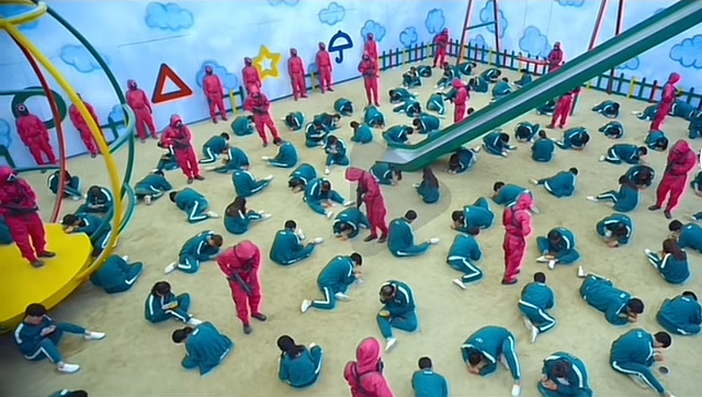 说话的是一个身着红衣头戴面具的管理员,对方手上还拿着步枪。