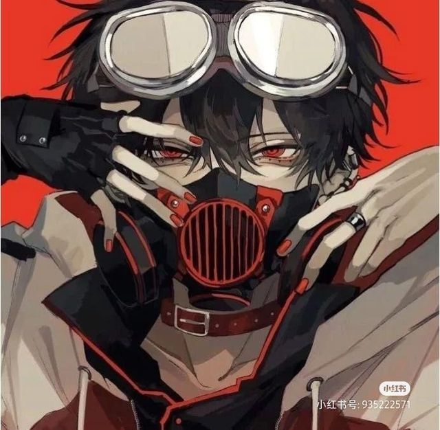 外貌描述:黑色的头发,红色的眼睛,瞳孔是一圈一圈的,右手戴着露指手套,因为喜欢研究和制作各种东西所以随时戴着护目镜和防毒面具,脖子上戴着红色项圈,里面穿着黑色衬衫,外面穿着红白卫衣,下半身穿着黑色裤子,和红色运动鞋。