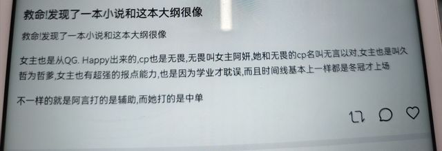 作者大大大大已经很久没有更新了,但是我也实在是没有想到再次更新居然是因为这件事情。 因为面临考研,我几乎已经是两个月更新一点了,今天上软件,就是想看看大家的反馈然后更新一下 但是看见了一个宝子的留言,说看见了一本书大纲跟我的第一本KPL书籍《王者荣耀:别动我家辅助!》很像 无论是从QGhappy出身还是强大的报点能力还是跟无畏的CP,我并不觉得这是雷同。 不要跟我说你的女主叫阿妍,我的是阿言,你的女主打的是中路,我的是打辅助的。 雷同一点我接受,但是你雷同那么多让我很不能接受。 一开始写文都是为爱发电,但是这种行为让我很不舒服。所以如果读者宝子们看见这本书,希望大家能跟我联系一下,告诉我书名叫什么(可能不在话本在🍅) 在处理好这件事之前,更新都会被暂时搁浅了,希望大家理解。 阿言是我一笔一笔写出来的人物,希望大家尊重!