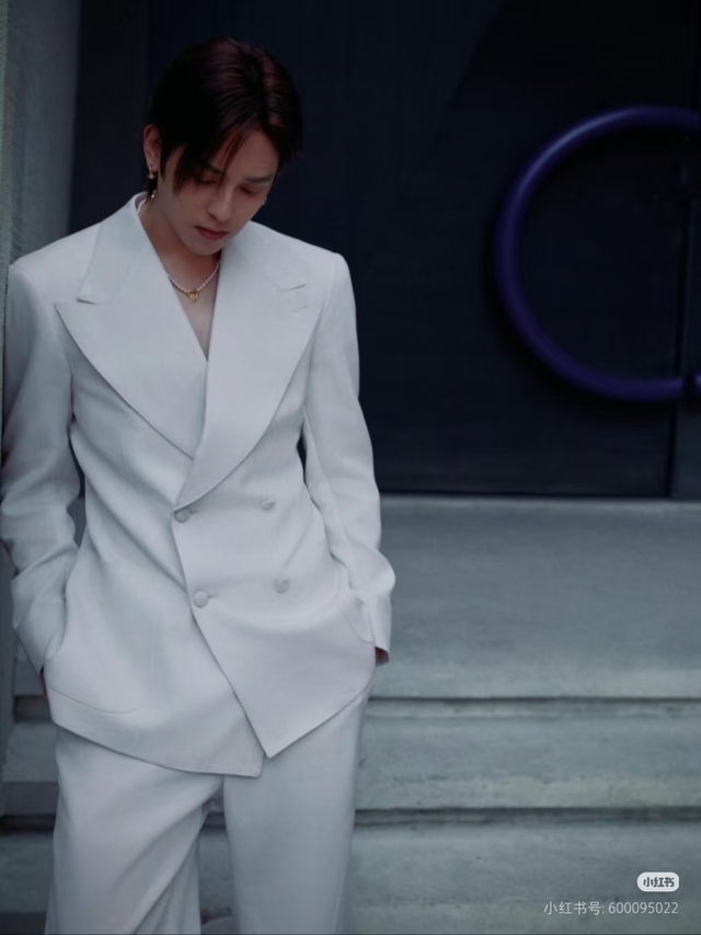 你这才注意到他今天穿着白色的西装,发丝浅浅的遮住眼睛