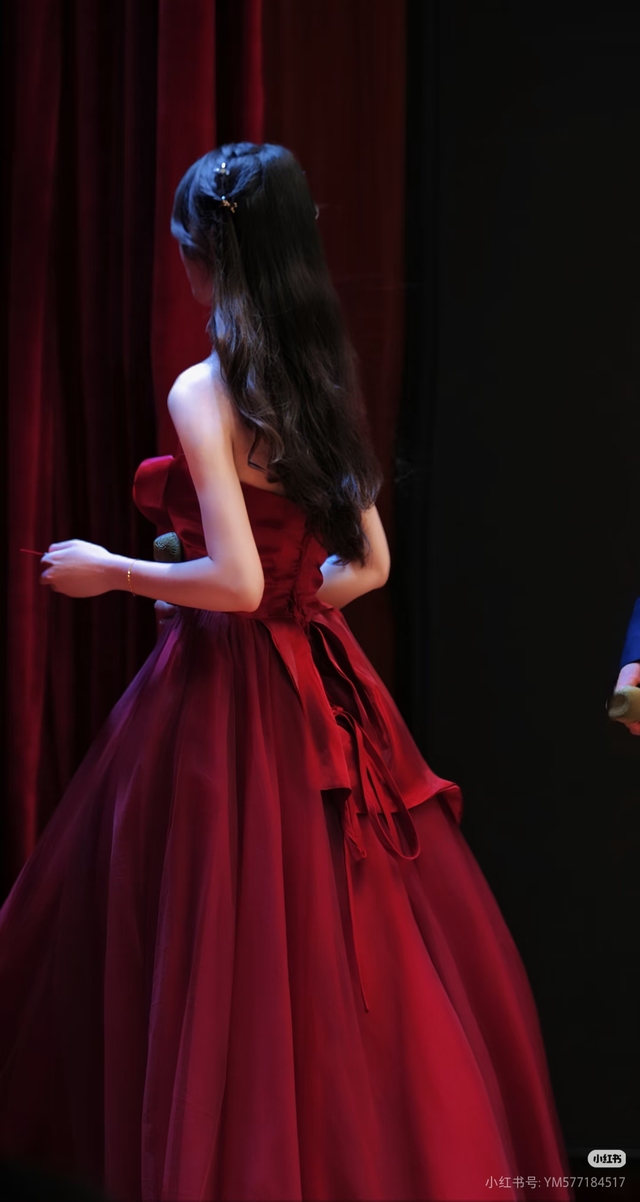 她穿着一身红色紧身包臀鱼尾裙,发丝轻轻别在耳后