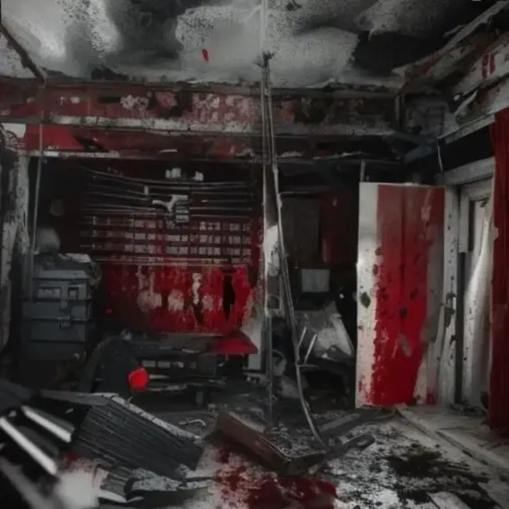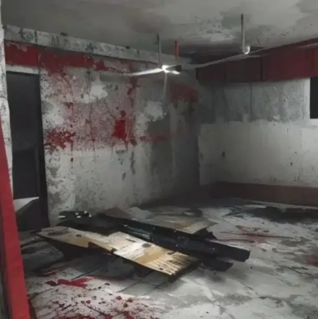 屋内一片狼藉,家具破损,物品散落一地。血迹斑斑的地板上留下了混乱的脚印和痕迹,仿佛一场可怕的争斗在这里发生过。