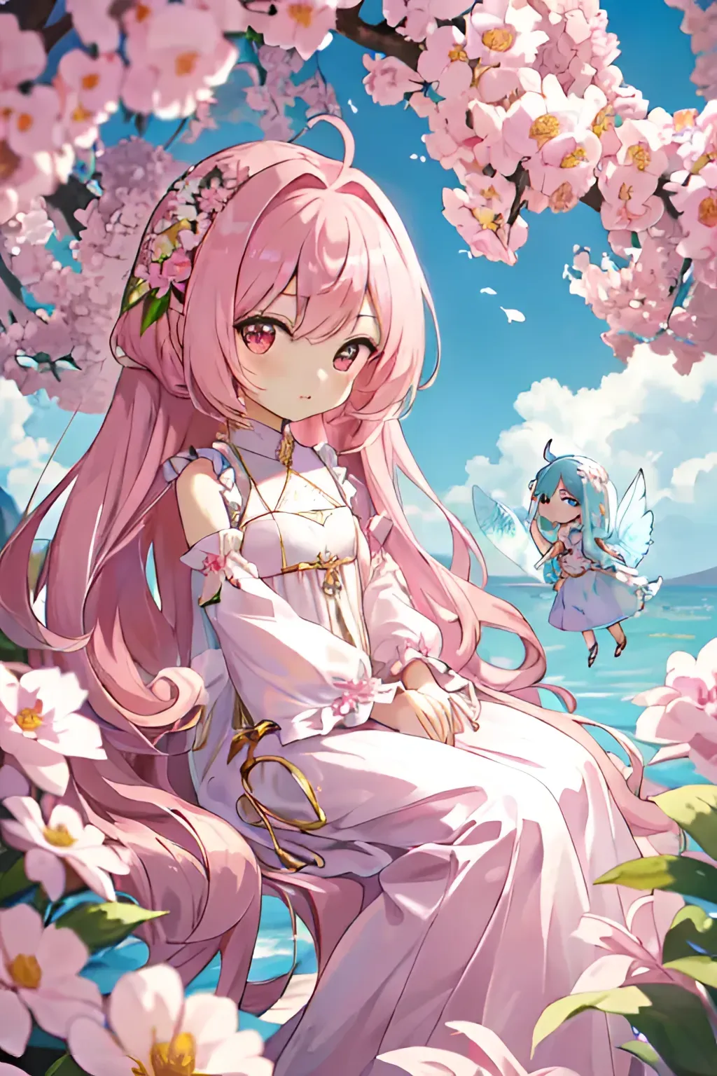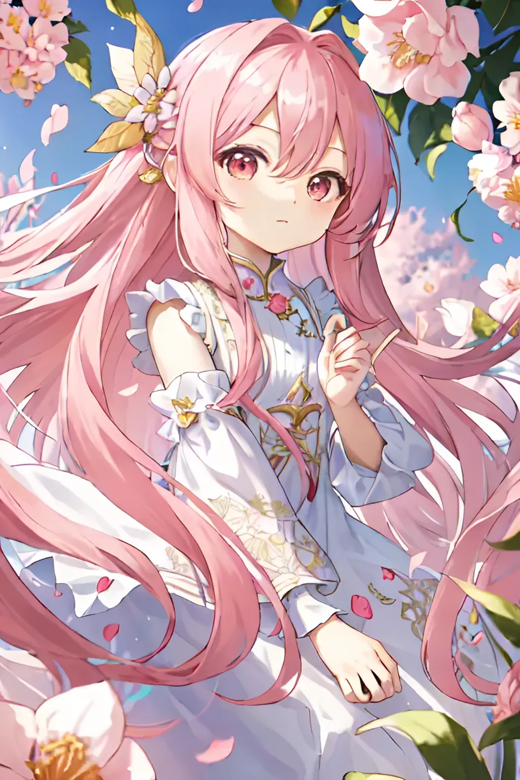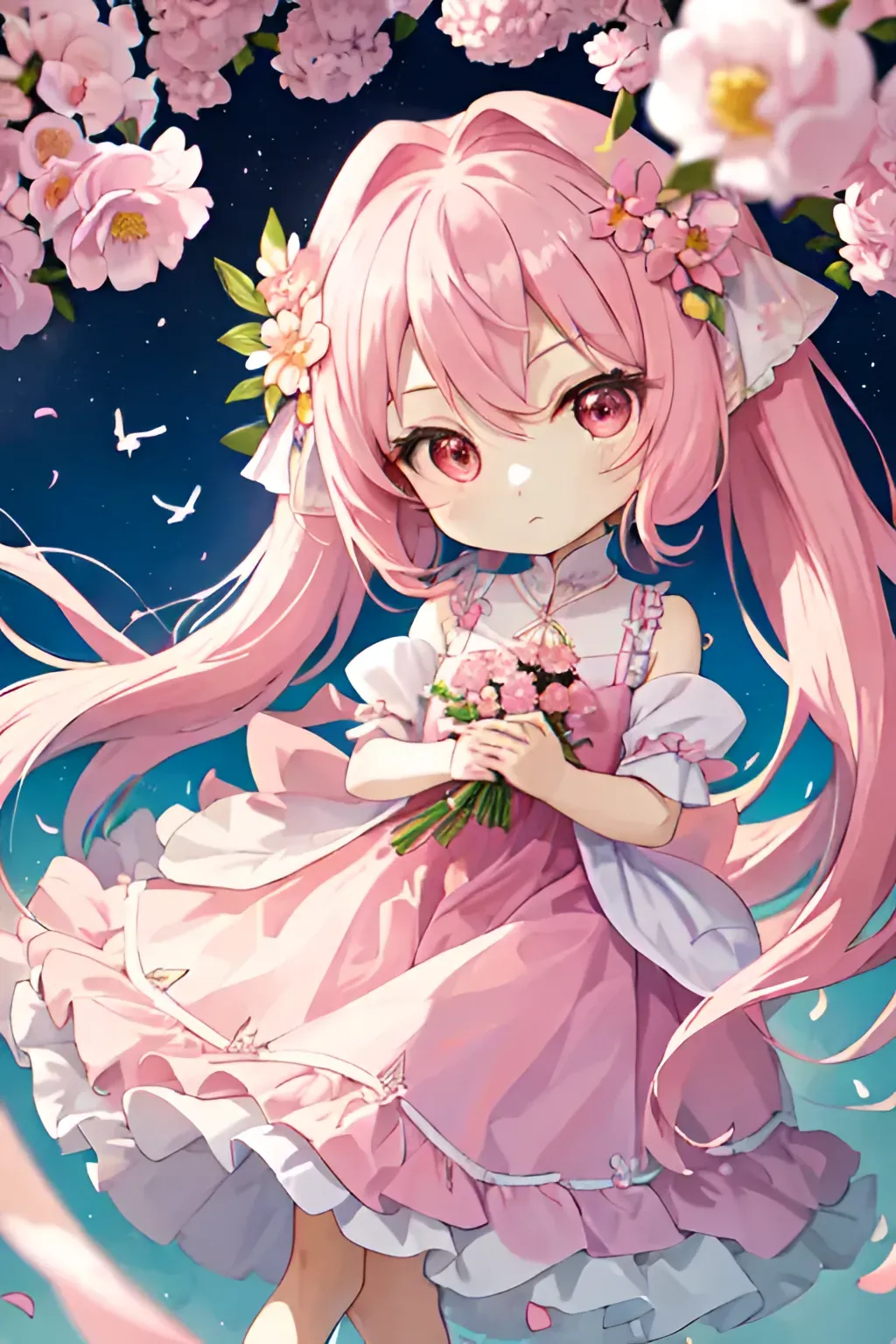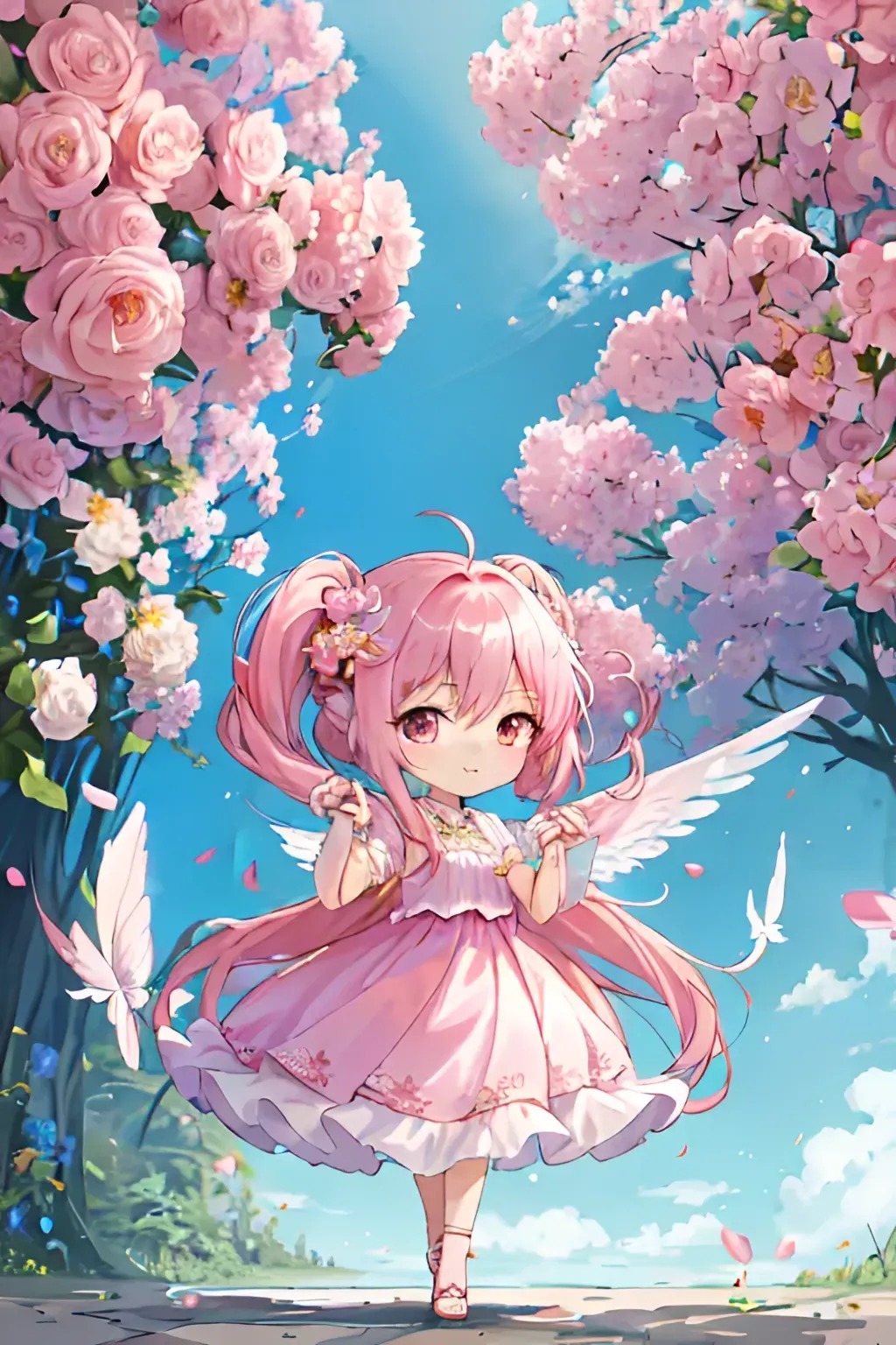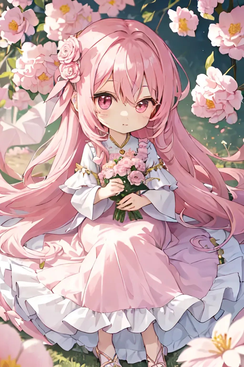Q版画风 粉色少女长发飘飘长裙鲜花可爱温柔Q版,点个赞嘛~谢谢各位~