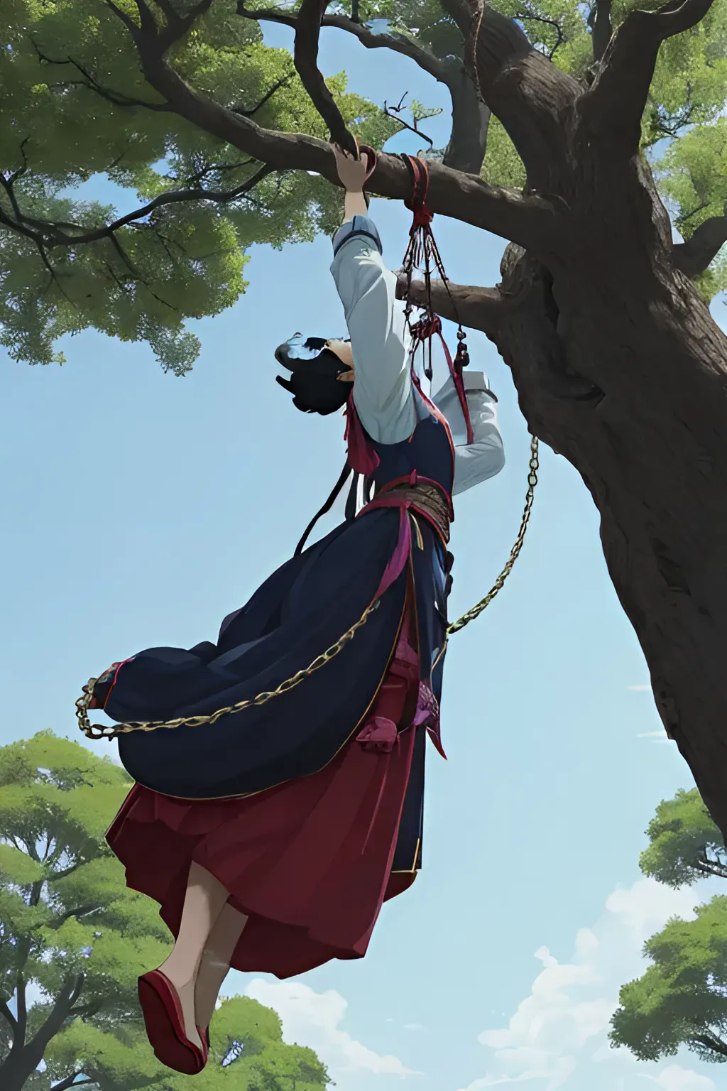 再晚一点的话,你的妻子就要窒息而亡了 好,风兄,我们走 弟弟,快跟上 来了 一行人急急忙忙飞奔,赶往目的地一小时后,抵达目的地 这时看到,一名女子被吊在半空中大树上,屹然伫立着,一个被锁链锁住的女子 溯溪,是你吗,回答我 此时的溯溪,极其微弱的呼唤着钰哥哥··…救我·……咳咳咳,溯溪 等我 我这就来救你