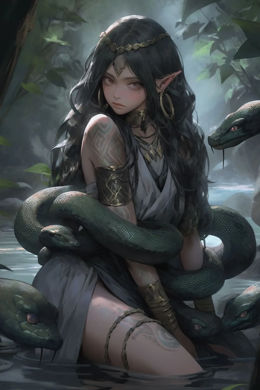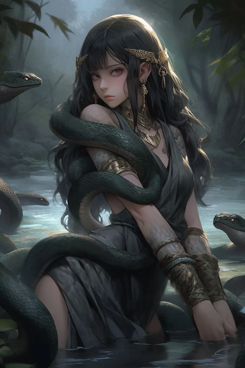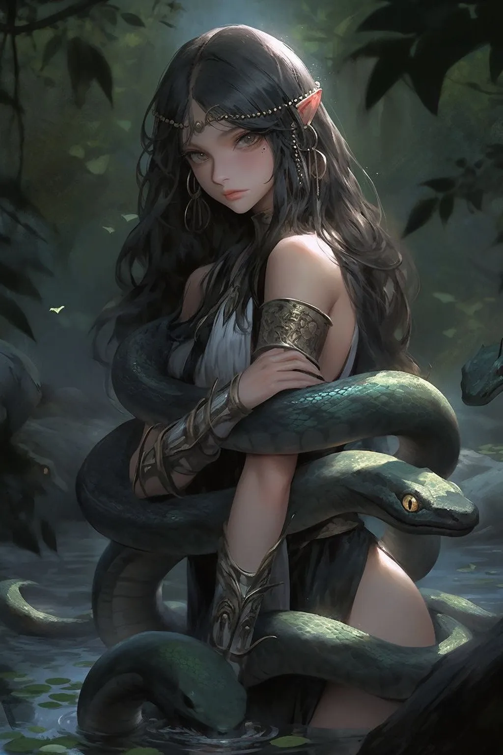 在这片神秘的森林中,生活着一个女孩,她有着乌黑的头发和晶莹的眼眸,她是森林中的精灵。她总是独自一人住在森林的深处,与蛇为伴,过着与世隔绝的生活。