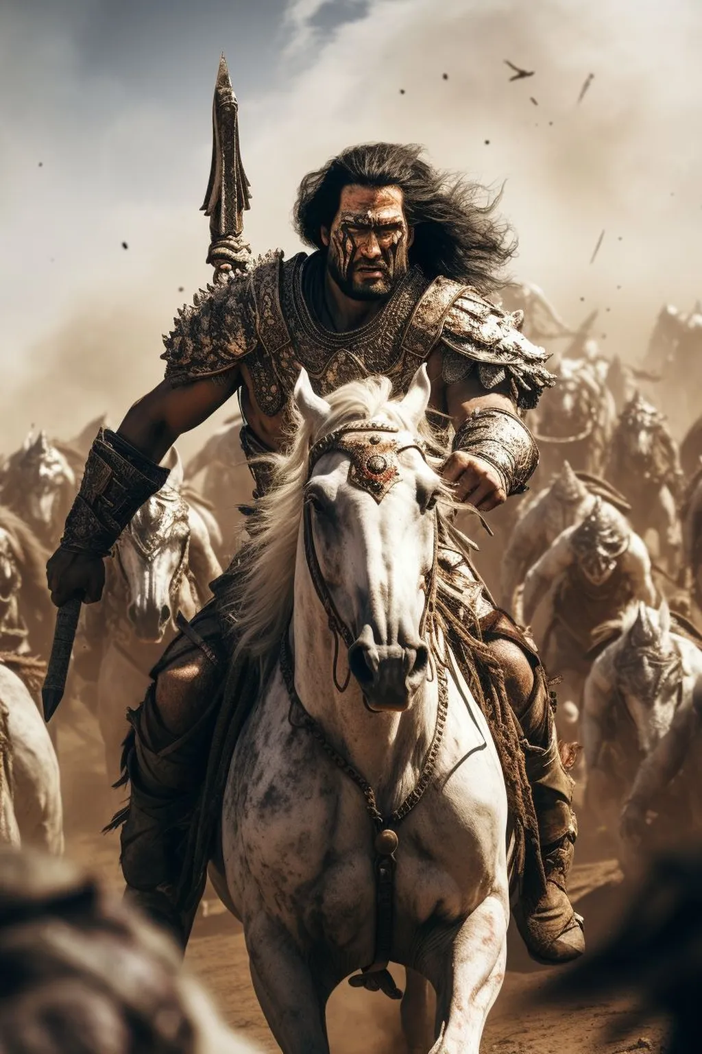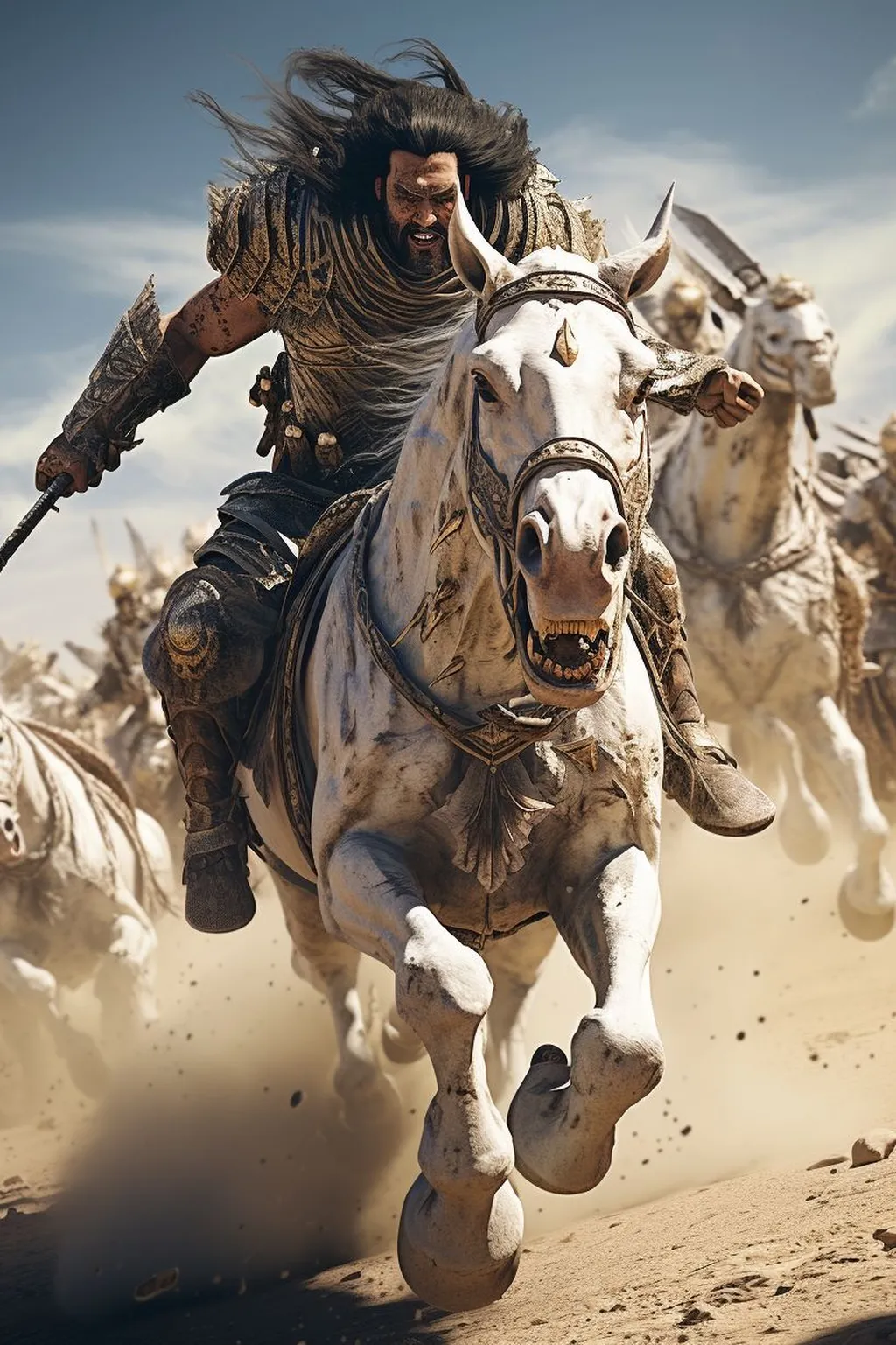 战场上的气氛瞬间紧绷,每一个战士都握紧了手中的武器。他们的战马也感受到了主人心中的决心,它们嘶鸣着,刨着地,迫不及待地想要冲向敌军。苍天啸骑的战士们彼此鼓舞着,他们的眼神中充满了坚定与信念。