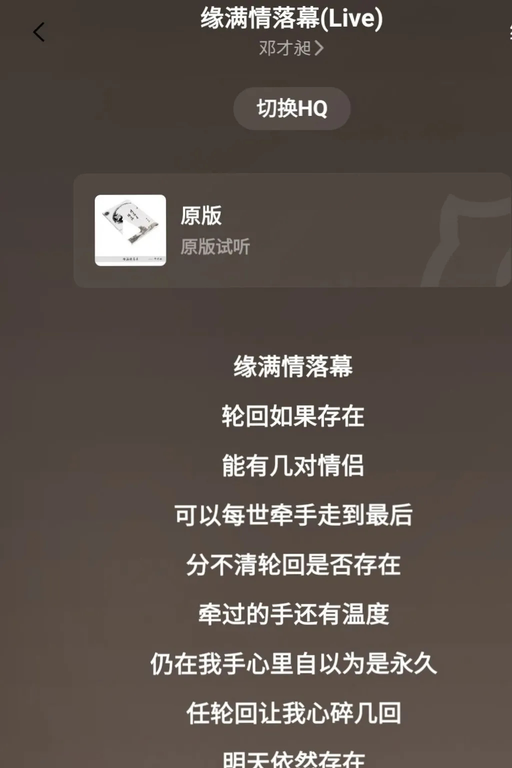 两个版本的缘满情落幕歌曲,两个歌名有点不一样可是词是一样的,就是一个是独唱版一个是合唱版,欢迎各位新老朋友去全民K歌去听去评论都行。
