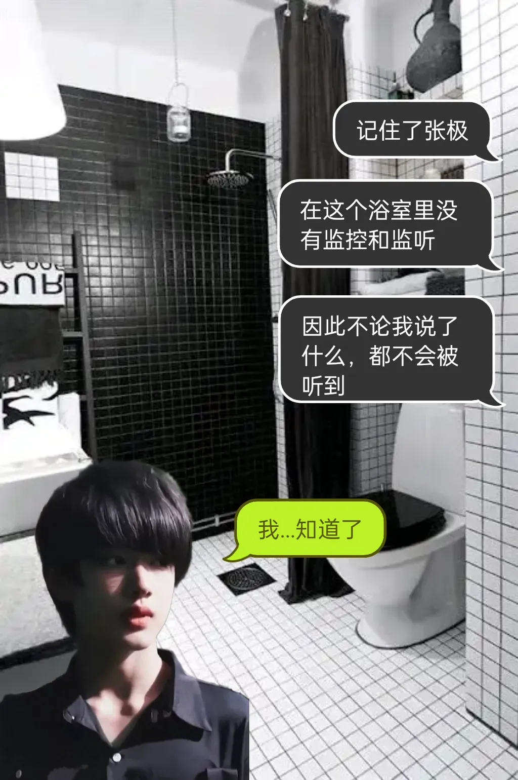 怕他不放心我特意贴心的补充了一句 “放心,我不会看你洗澡的,你把幕帘关严实就行。”