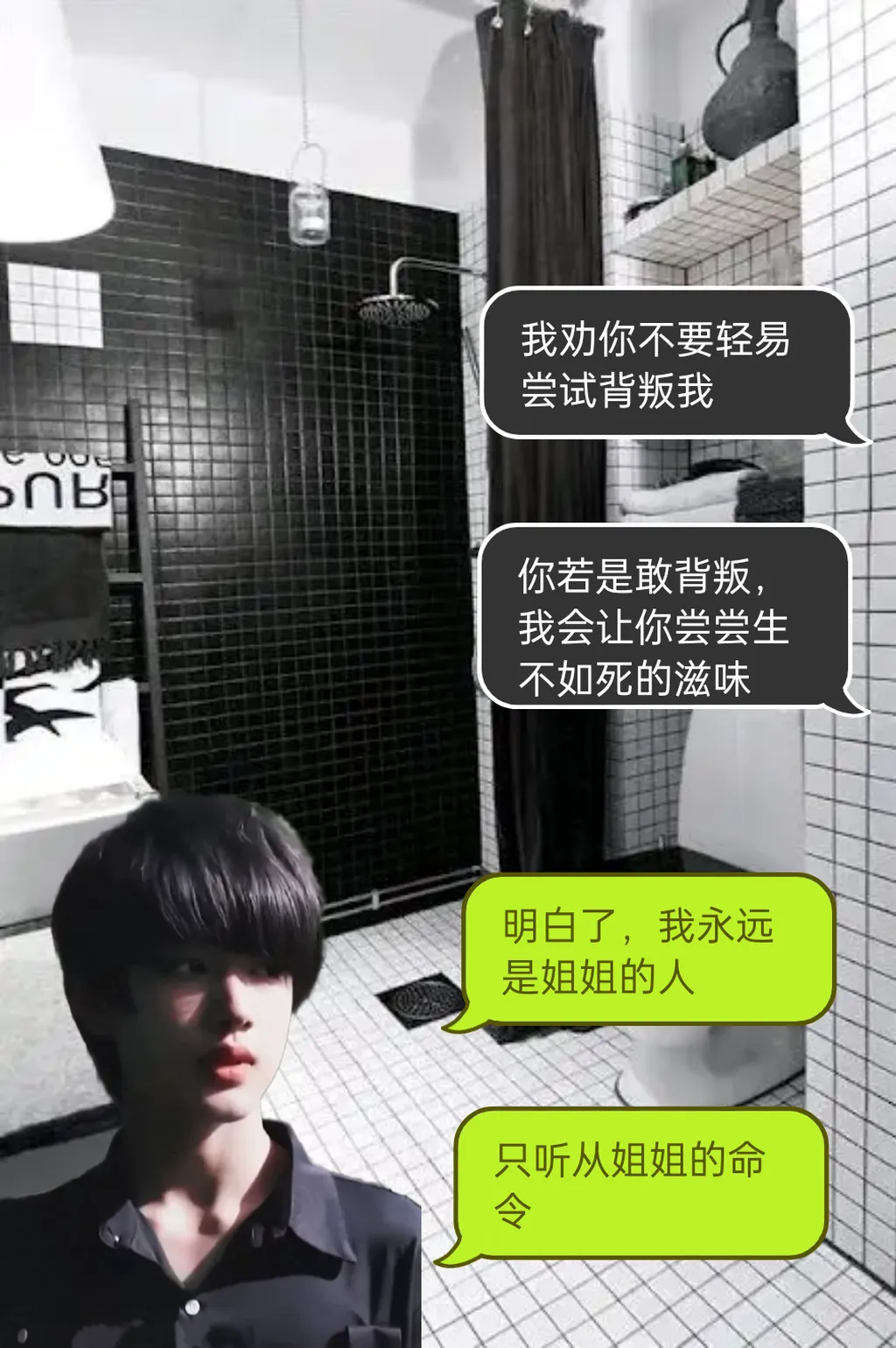 浴淋间的喷头冲刷着他身上的泥泞,听着幕帘之外,我略显霸道的话语,他小心翼翼的反问。