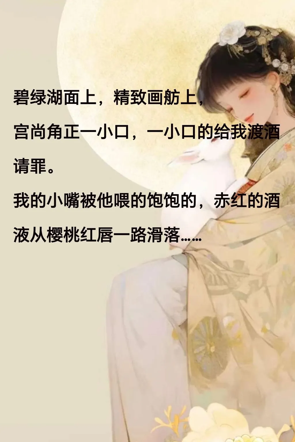 碧绿湖面上,精致画舫上,宫尚角正一小口,一小口的给我渡酒请罪。 我的小嘴被他喂的饱饱的,赤红的酒液从樱桃红唇一路滑落……