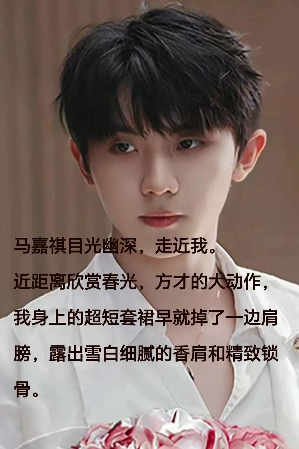 马嘉祺目光幽深,走近我。 近距离欣赏春光,方才的大动作,我身上的超短套裙早就掉了一边肩膀,露出雪白细腻的香肩和精致锁骨。
