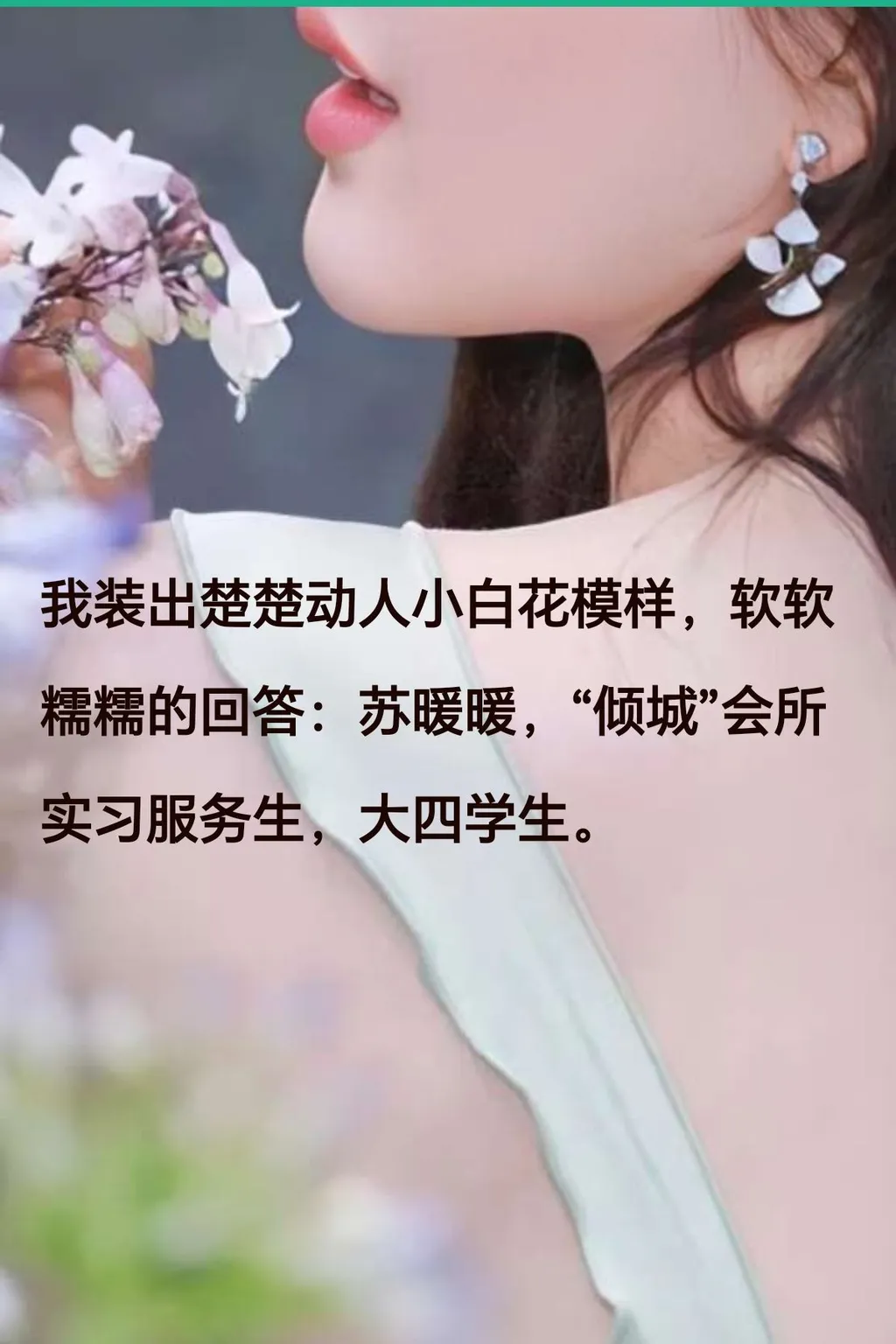 我装出楚楚动人小白花模样,软软糯糯的回答:苏暖暖,“倾城”会所实习服务生,大四学生。