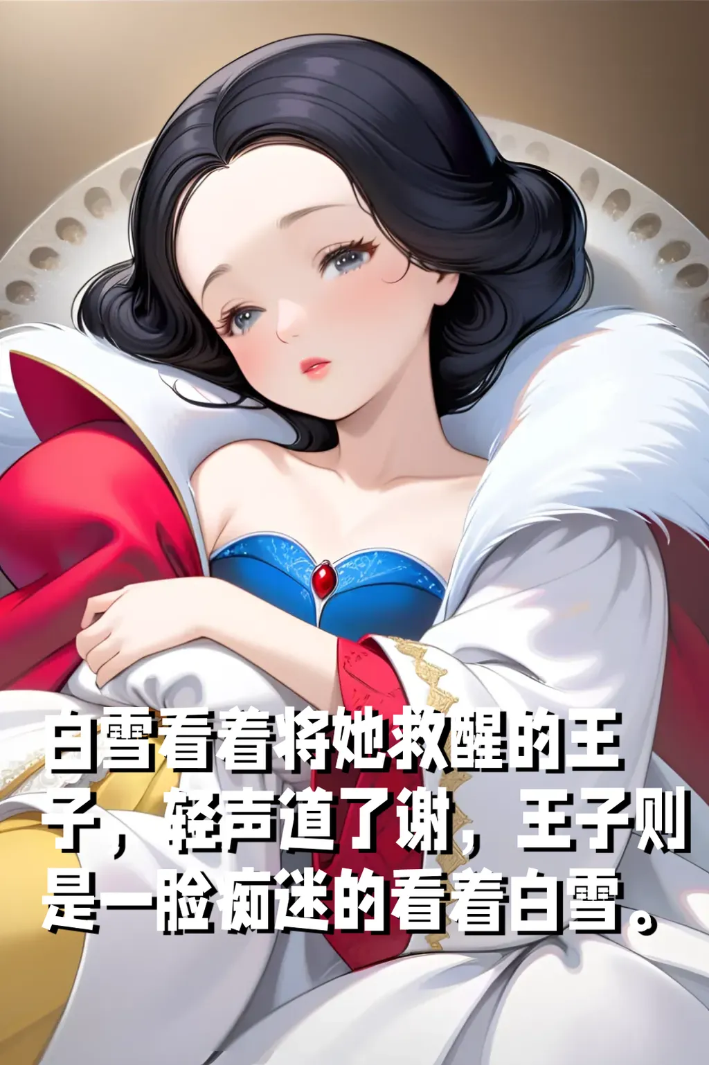 白雪看着将她救醒的王子,轻声道了谢,王子则是一脸痴迷的看着白雪。