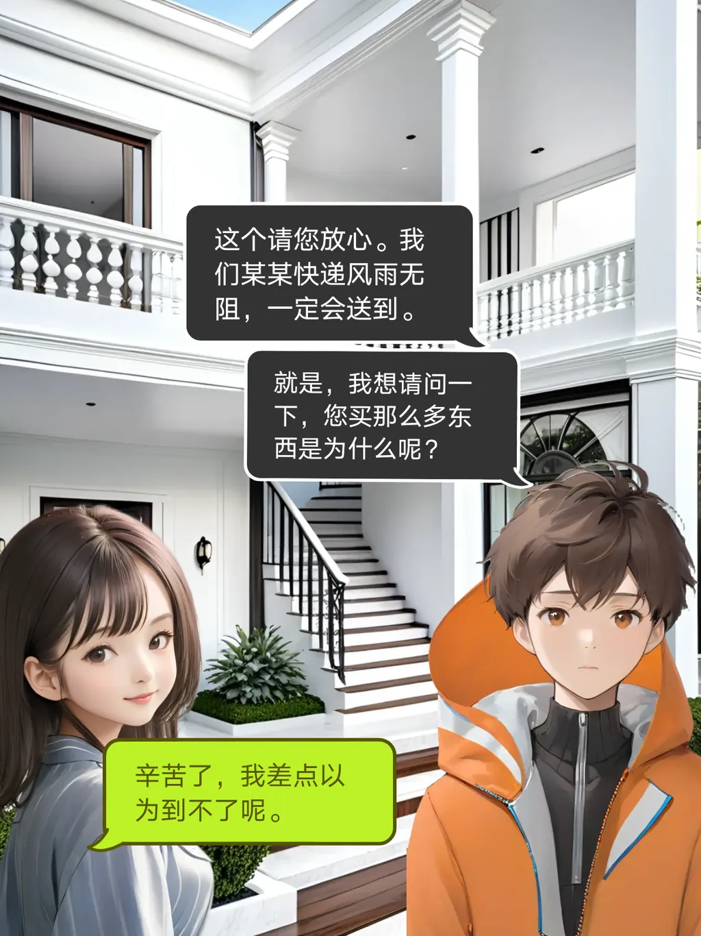 一个穿着某某快递背心的小哥敲着门,在他身后则是一辆装满货物的卡车。