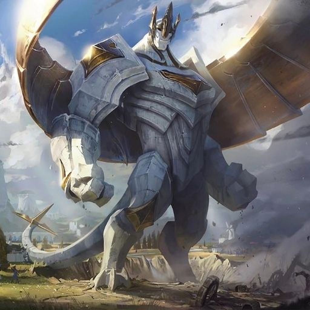 幸存下来的士兵士气低落,在加里奥身边缩成一团。就在他们万念俱灰之时,一个缓慢低沉、震耳欲聋的轰鸣响彻山谷,就像是两侧的高山在互相角力碰撞。一个巨大的阴影缓缓升起,德玛西亚士兵拿出最后的坚毅,做好慷慨赴死的准备。